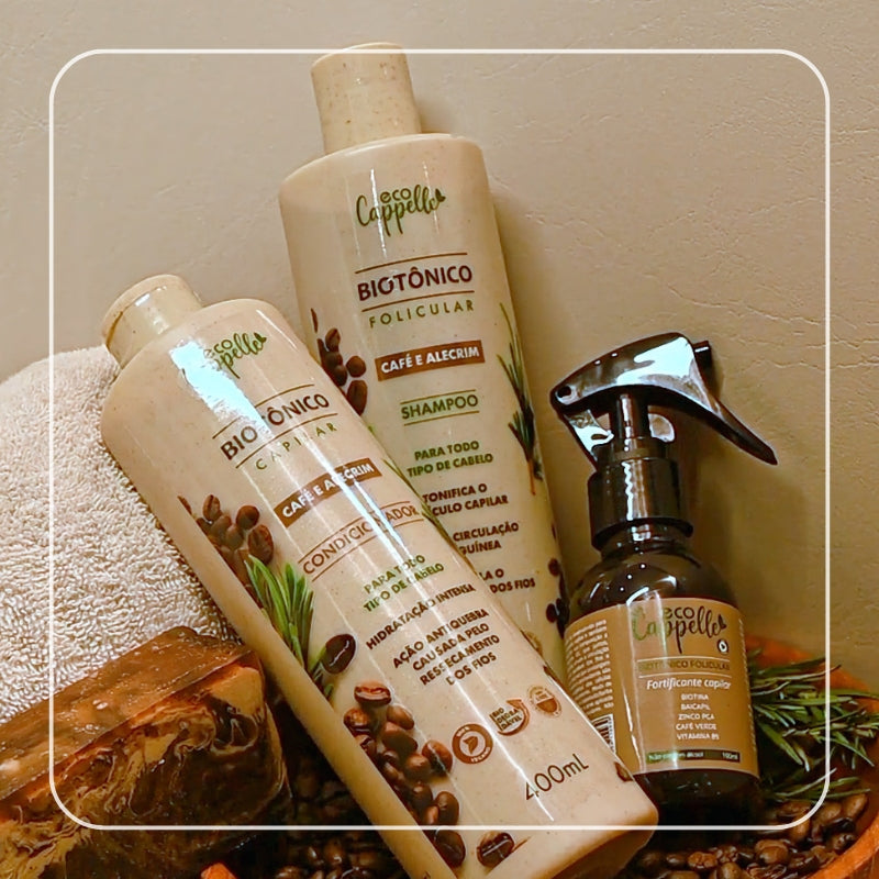 O Kit Biotônico folicular Café & Alecrim é indicado para todos os tipos de cabelo, com queda moderada e/ou intensa e folículos capilares frágeis com fios finos sem força para crescer.